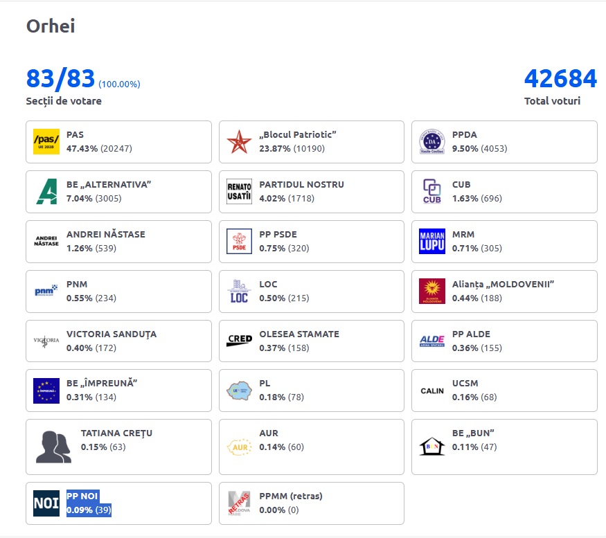 Potrivit datelor făcute publice de CEC ieri în raionul Orhei au fost exprimate 42684 voturi valabile, la urne prezentându-se 44341 de persoane. Cele mai multe voturi – 20247 sau 47,43%, le-a obținut Partidul Acțiune și Solidaritate. Totuși rezultatul este mai slab comparativ cu alegerile parlamentare din 2021, când acesta obținea 21571 voturi, sau comparativ cu turul II al alegerilor prezidențiale de anul trecut când candidata PAS a obținut 23305 voturi.
